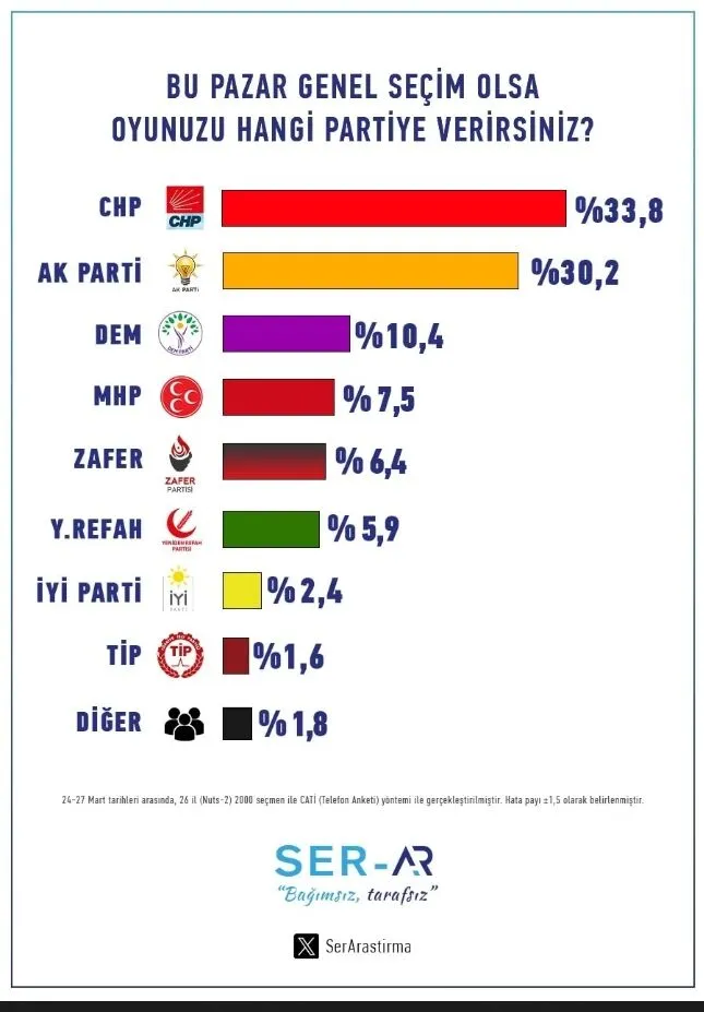 Ser Araştırma’nın 24-27 Mart tarihleri arasında 26 ilde 2 bin kişiyle CATI (Bilgisayar Destekli Telefonda Anket) yöntemiyle yaptığı çalışmada, CHP’nin yüzde 33,8 ile birinci parti olduğu görüldü.